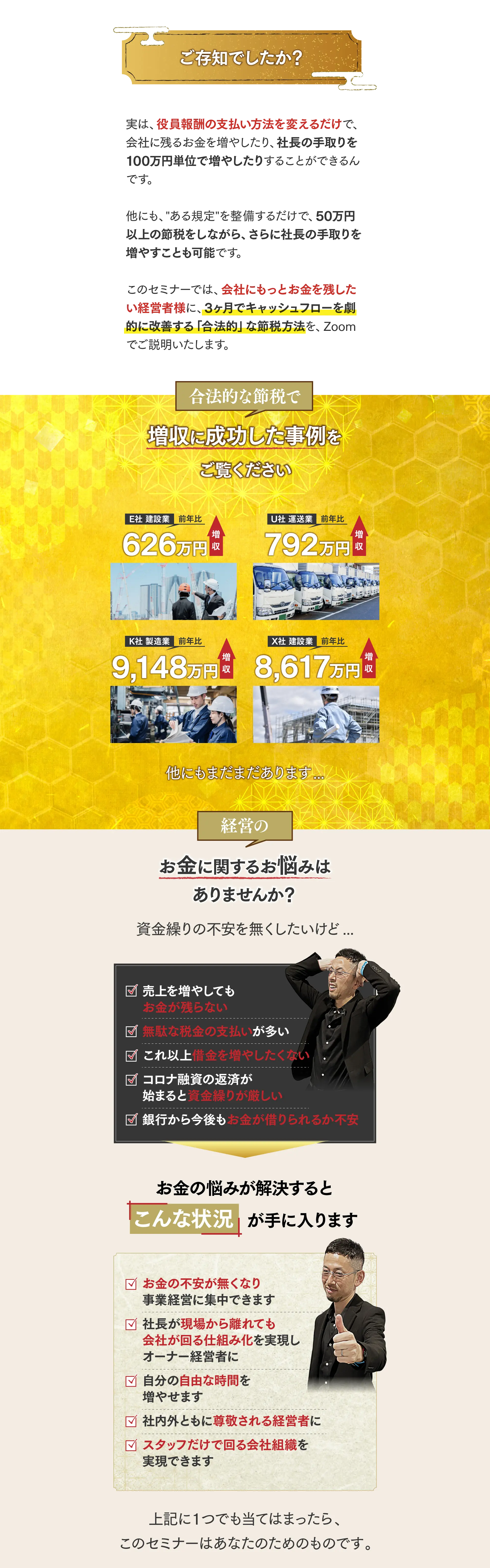 目標とする売上、利益を達成してもなかなか想定していたキャッシュフローを残す事が出来ず、顧問税理士に聞いてもその理由がわからずじまいだったのですが、本講座の内容にドンピシャに当てはまってました。