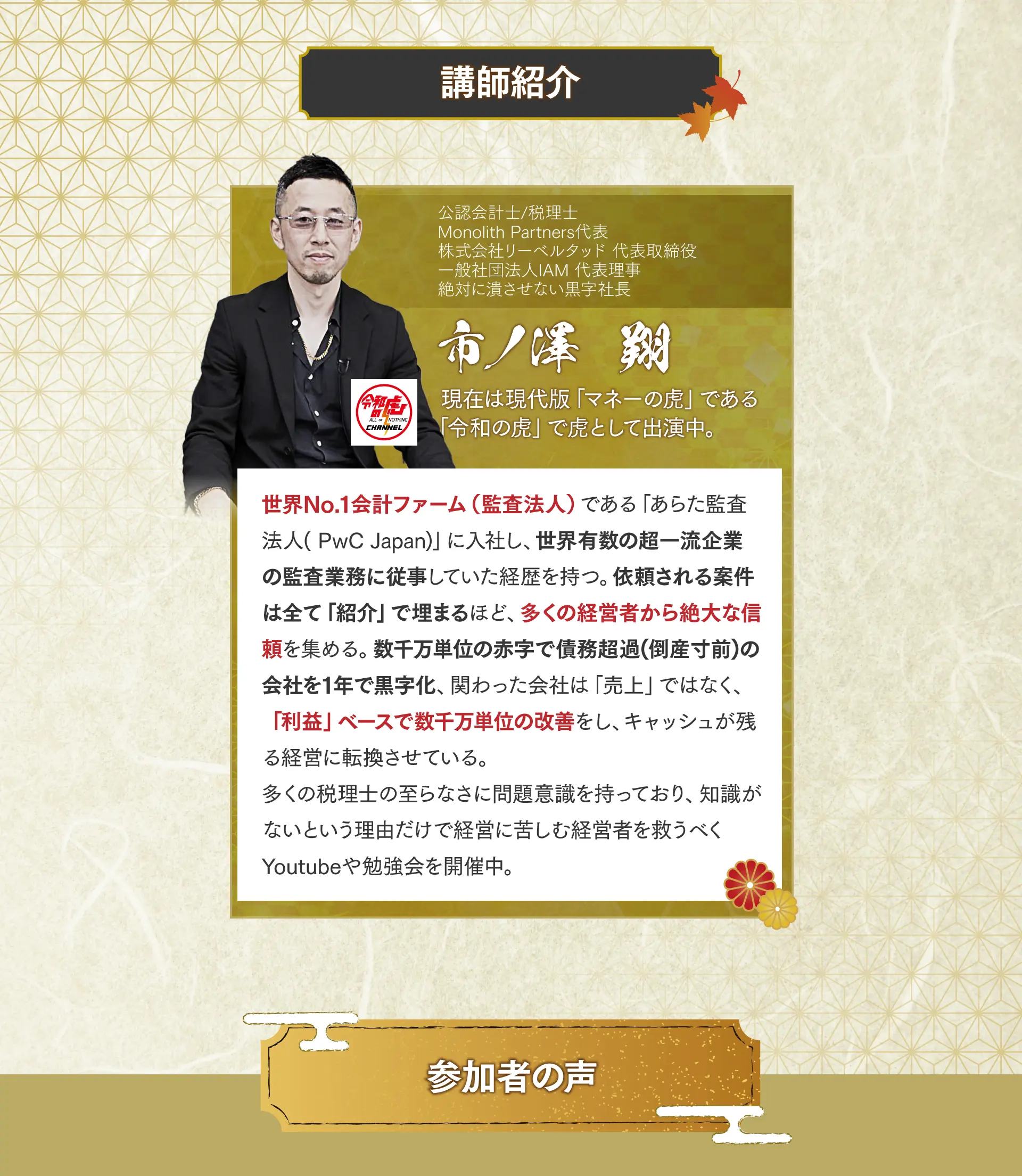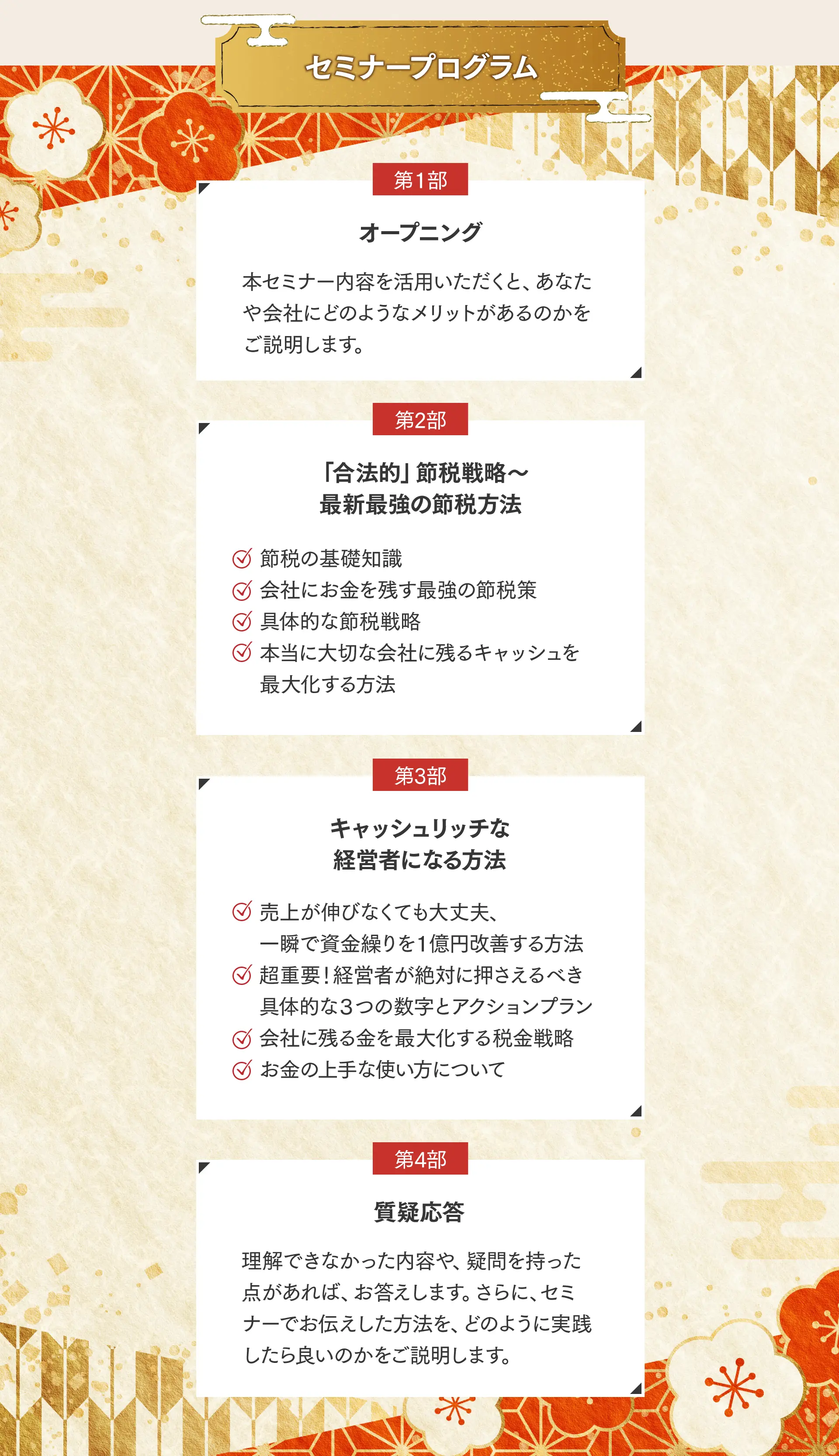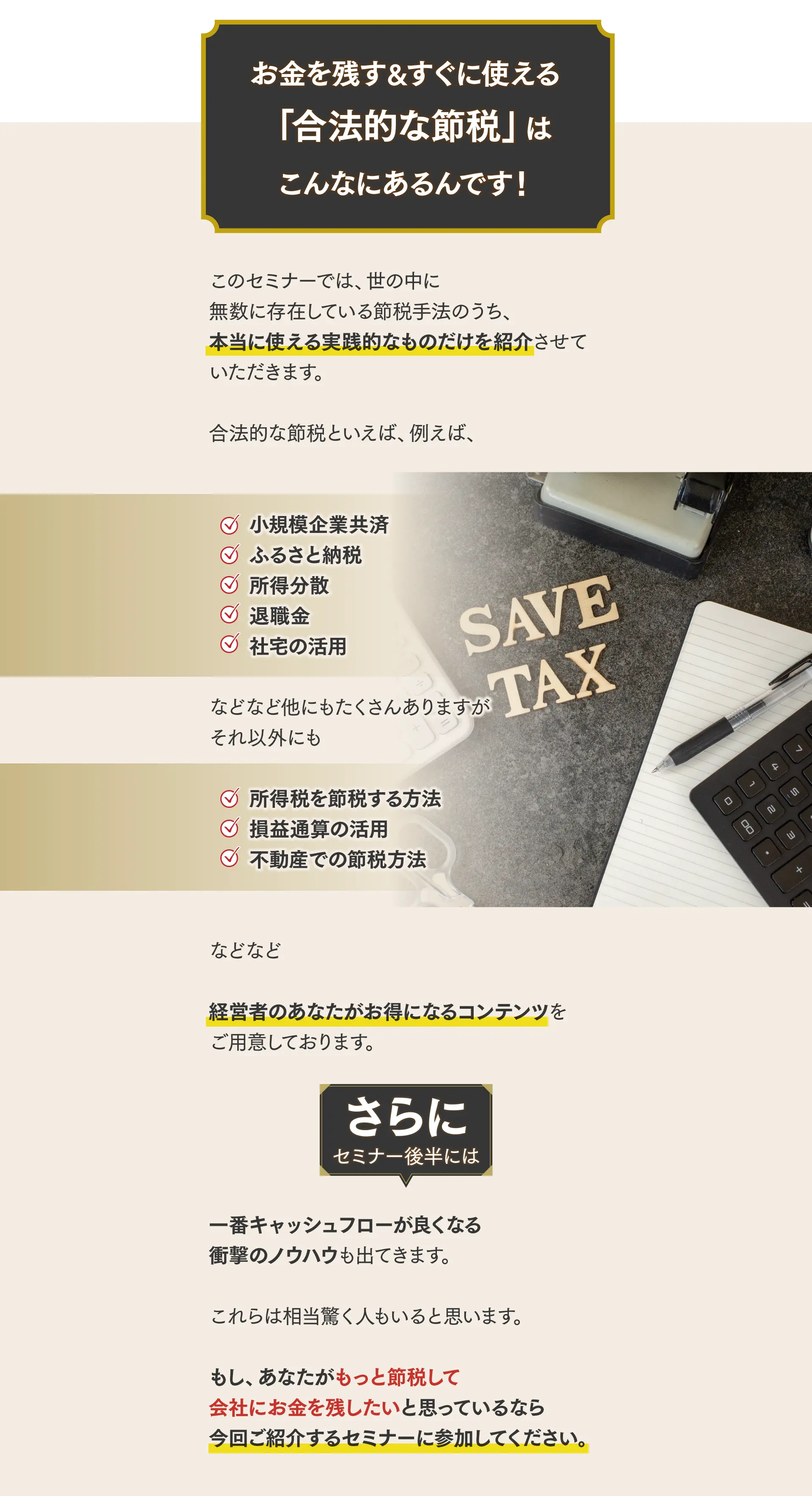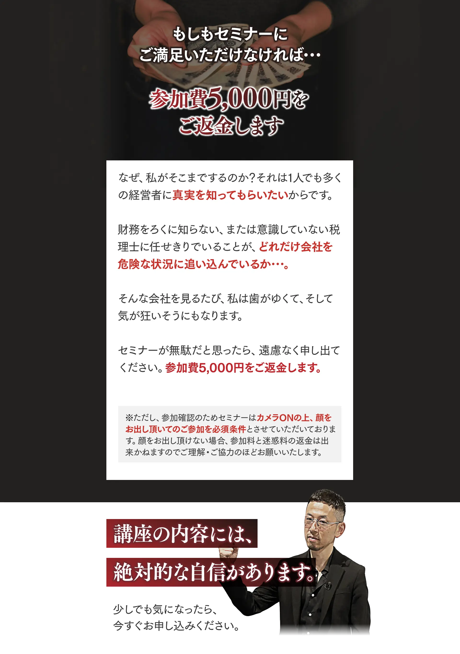 節税の事ばかり考えている経営者の方には是非本講座に参加していただけると、利益、キャッシュを残す方法などより本質的な事に目を向けられるようになりますので是非一緒に学んでいきましょう!