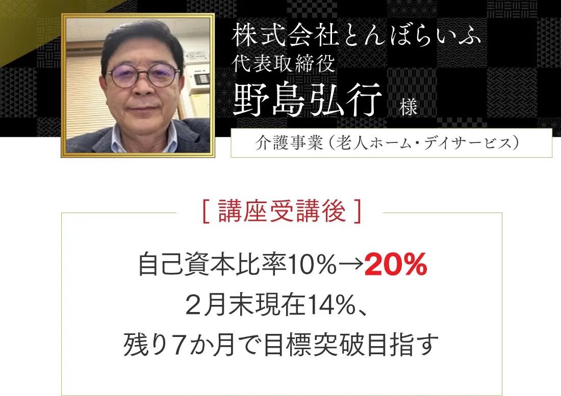 本講座で学んで決算書を見てみると、まさに一番やってはいけないことをしていて、売上なんて増やさなくても資金繰りを劇的に改善させられる。という事がわかり経営が楽しくなりました。本当にありがとうございます。